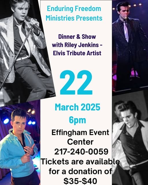 Dinner and show with world renowned Elvis Tribute Artist Riley Jenkins! Riley will sing a variety of Elvis tunes. This event is a fundraiser for Enduring Freedom Ministries' Missions. Your dollars will go toward their free kitchen, free grocery and clothing stores, hair salon, and laundromat. All free and for everyone! To purchase tickets, call 217-240-0059. Advance tickets single $35/couple $60. At the door $40. Ticket includes dinner and show.